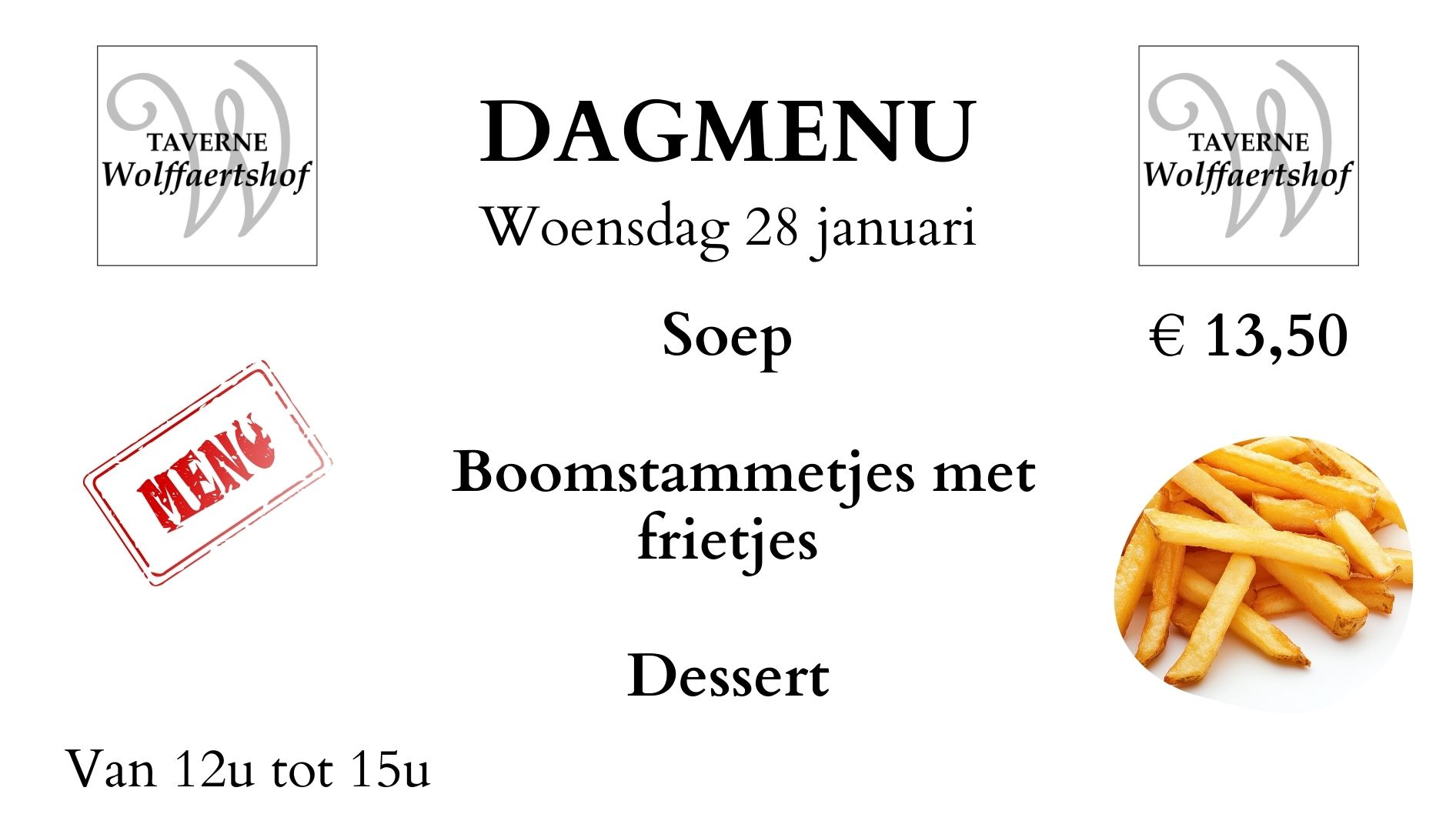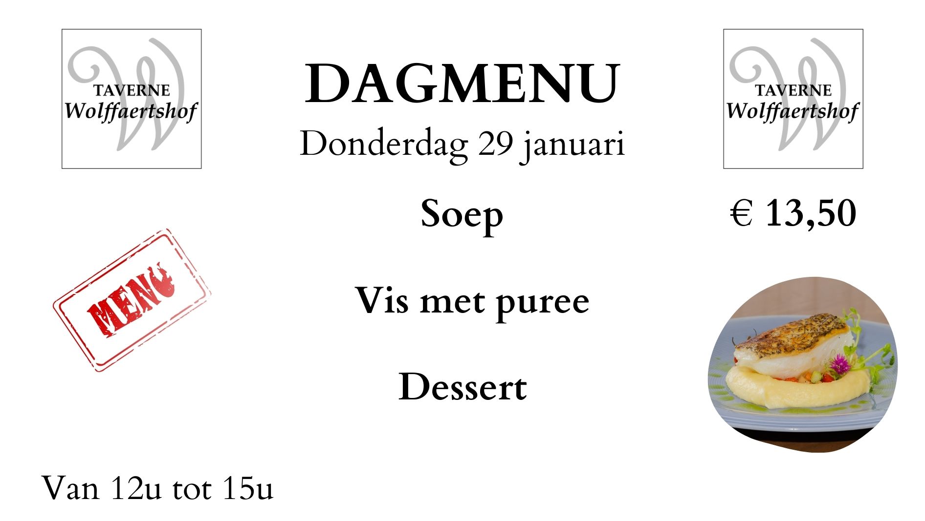 Bij ons kan je elke dinsdag, woensdag en donderdag van 12u tot 15u genieten van een speciaal dagmenu aan slechts 13,5 euro. Ontdek ze hier en op onze Facebookpagina.